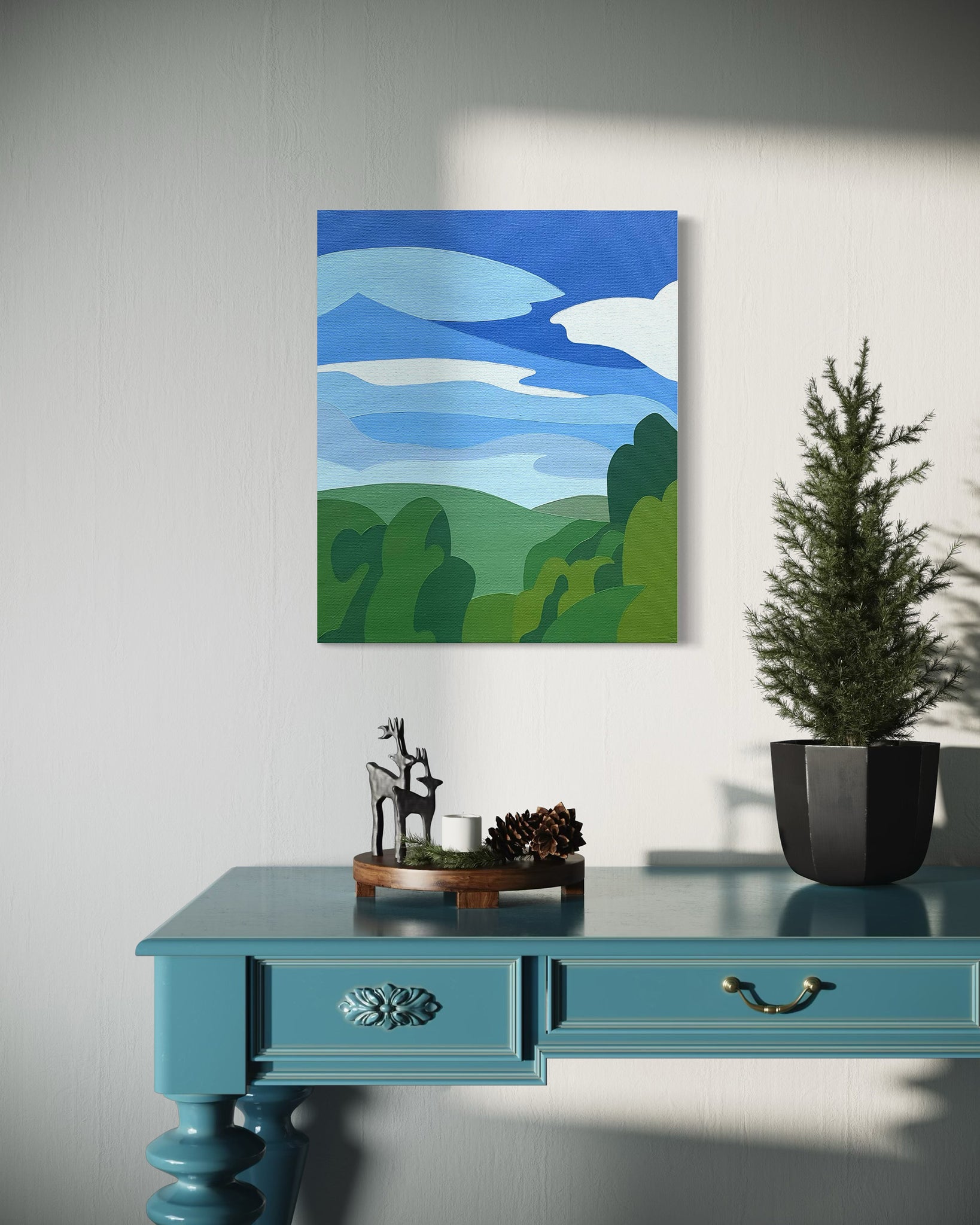 In this painting soft clouds drift through a pale morning sky above the vale, where layered treetops fade gently into the distance. Painted in calming shades of blue, grey, and green, this piece captures the quiet stillness of early morning in the countryside.