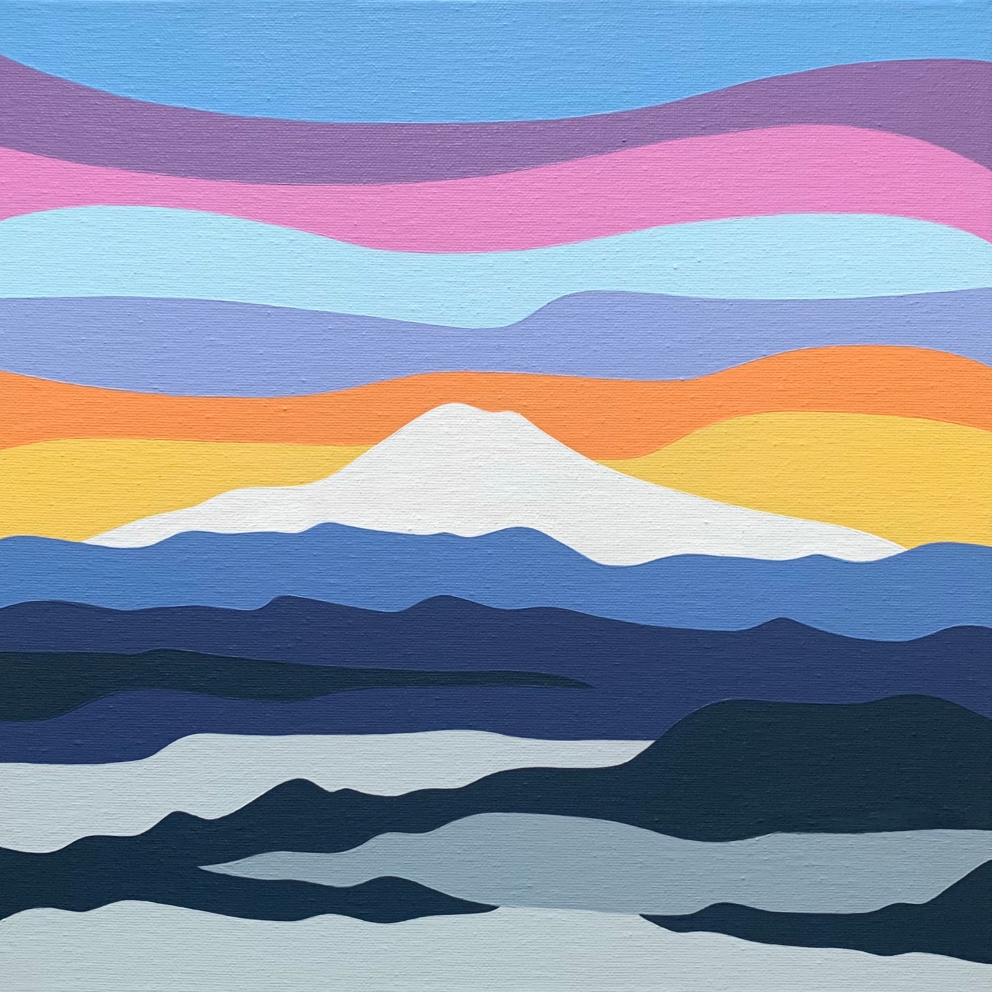 Mount Hood Inversion shows Mount Hood at sunrise rising above the cloud inversion in the valley. With smooth layers of colour across the sky to create that classic “mountain rising out of the clouds” view you get on clear, cold mornings. The clean shapes and colours give it a modern, calm look.
