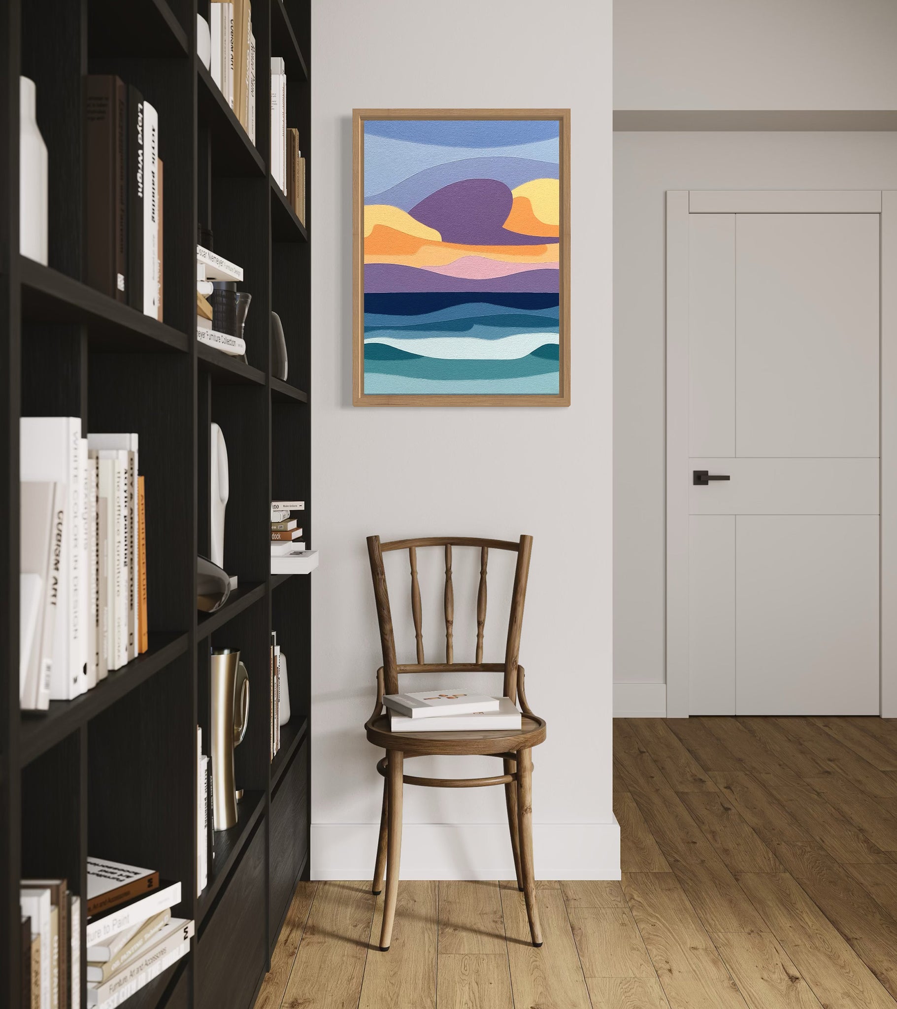 Storm Clouds Over the Sea captures the meeting of sky and water through bold, simplified forms. Layers of blues, purples, and warm tones suggest shifting waves beneath heavy clouds. A contemporary seascape that balances movement with structure, ideal for anyone drawn to strong horizons and modern coastal art.