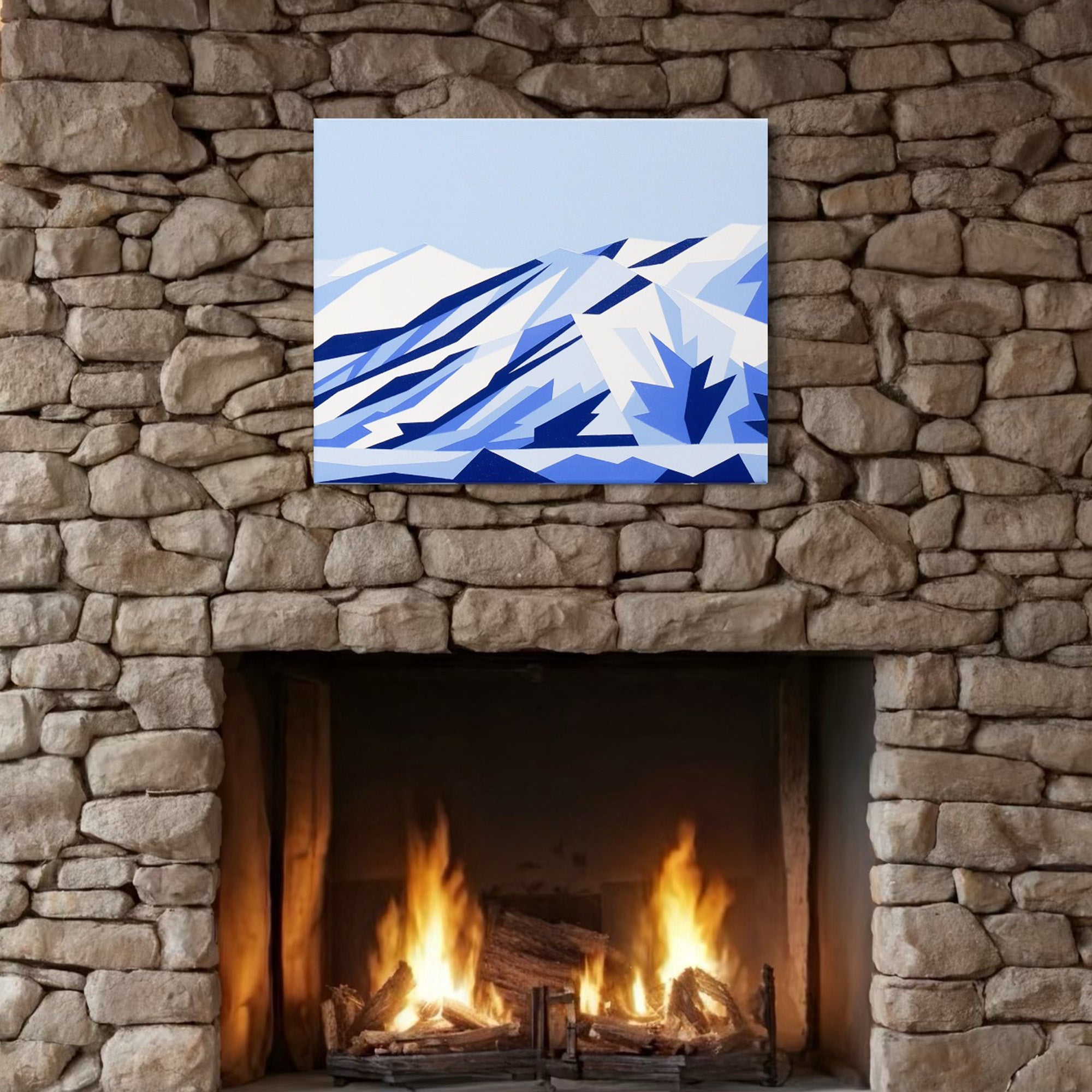 Experience the stunning beauty of New Zealand’s South Island with this original, hand-painted artwork featuring the majestic mountains surrounding Lake Pukaki. Painted in rich shades of blue, this geometric piece captures the dramatic, snow-capped peaks and rugged terrain that define this iconic landscape. The cool-toned palette and bold composition evoke the sense of awe and serenity that these towering mountains inspire.