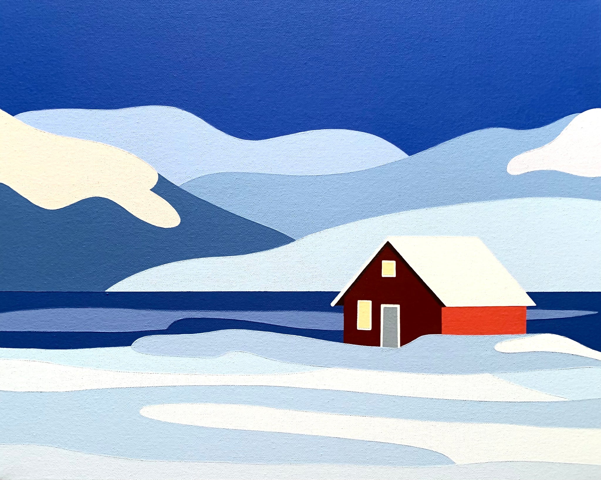 Arctic Sunset is a modern winter landscape featuring a bold red cabin set against deep blue skies and layered snow covered mountains. The contrast between the warm structure and the cool surroundings creates a strong focal point, while the sweeping snow shapes keep the composition clean and balanced.